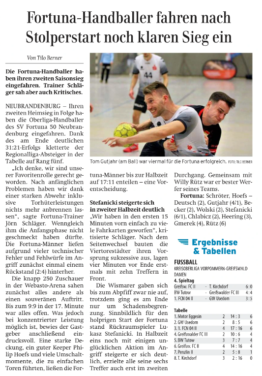 Nordkurier 14.10.2025: Fortuna-Handballer fahren nach Stolperstart noch klaren Sieg ein