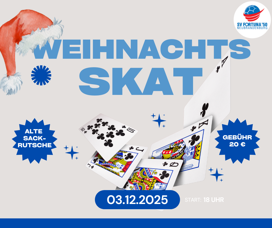Der SV Fortuna ´50 Neubrandenburg lädt alle Skatfreunde herzlich zum diesjährigen Weihnachtsskatturnier ein. In gemütlicher Atmosphäre soll am Kartentisch wieder gereizt, gespielt und natürlich auch gelacht werden.
