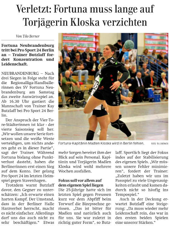 Nordkurier 24.10.2025: Verletzt: Fortuna muss lange auf Torjägerin Kloska verzichten