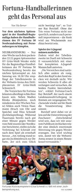 Nordkurier 07.11.2025: Fortuna-Trainer Schläger warnt seine Männer vor Überheblichkeit