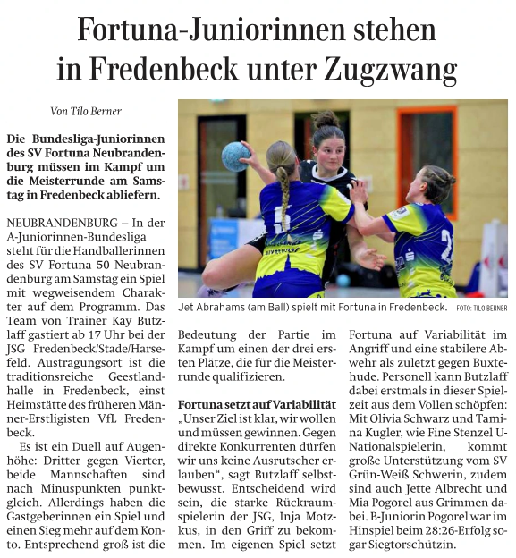Nordkurier 14.11.2025: Fortuna-Juniorinnen stehen in Fredenbeck unter Zugzwang