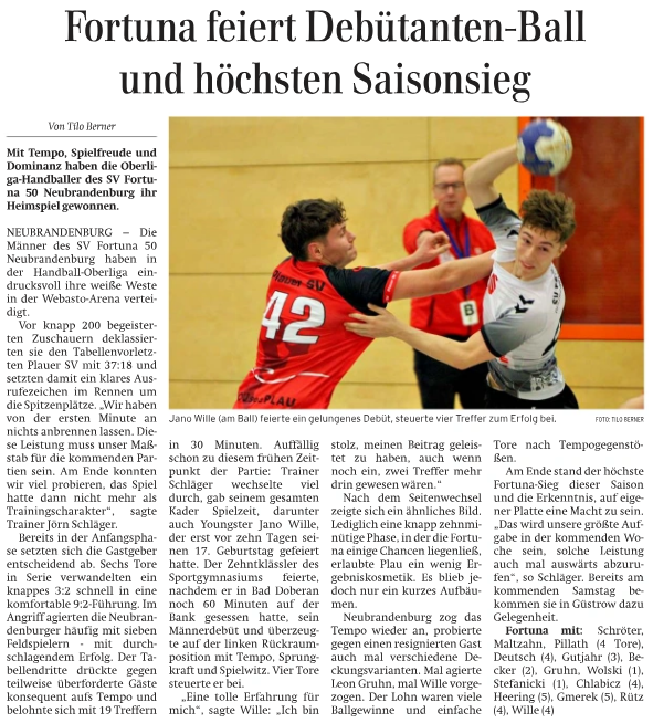 Nordkurier 08.12.2025: Fortuna feiert Debütanten-Ball und höchsten Saisonsieg