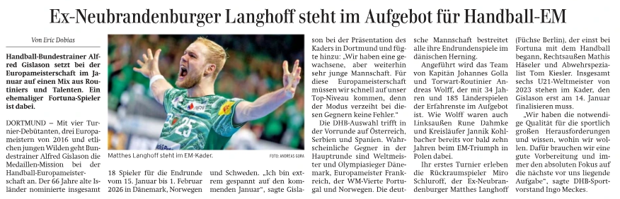 Nordkurier 18.12.2025: Ex-Neubrandenburger Langhoff steht im Aufgebot für Handball-EM