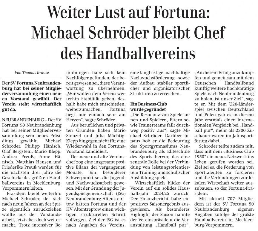 Nordkurier 19.12.2025: Weiter Lust auf Fortuna: Michael Schröder bleibt Chef des Handballvereins