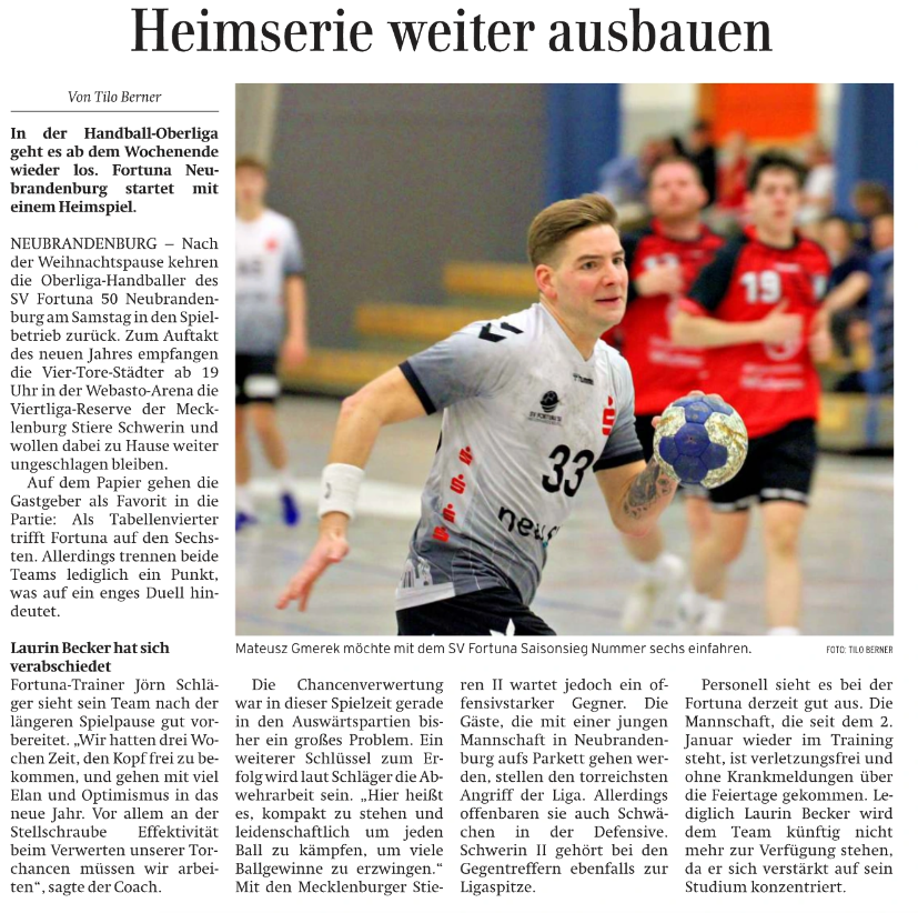 Nordkurier 09.01.2026: Fortuna-Handballer wollen ihre Heimserie weiter ausbauen