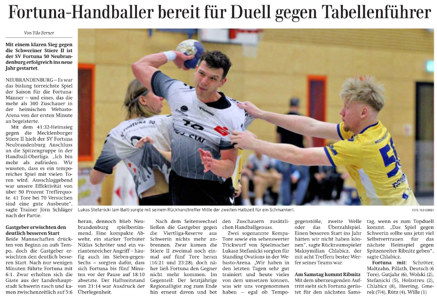 Nordkurier 12.01.2026: Fortuna-Handballer bereit für Duell gegen Tabellenführer