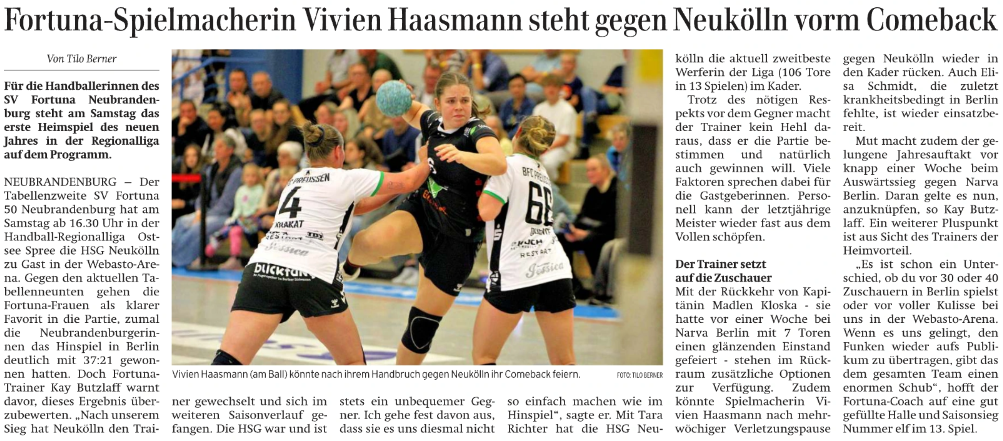 Nordkurier 16.01.2026: Fortuna-Spielmacherin Vivien Haasmann steht gegen Neukölln vorm Comeback