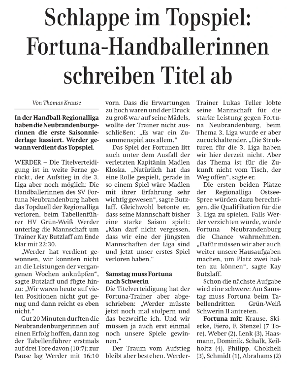 Nordkurier 16.02.2026: Schlappe im Topspiel: Fortuna-Handballerinnen schreiben Titel ab