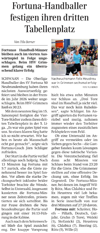 Nordkurier 23.03.2026: Fortuna-Handballer festigen ihren dritten Tabellenplatz