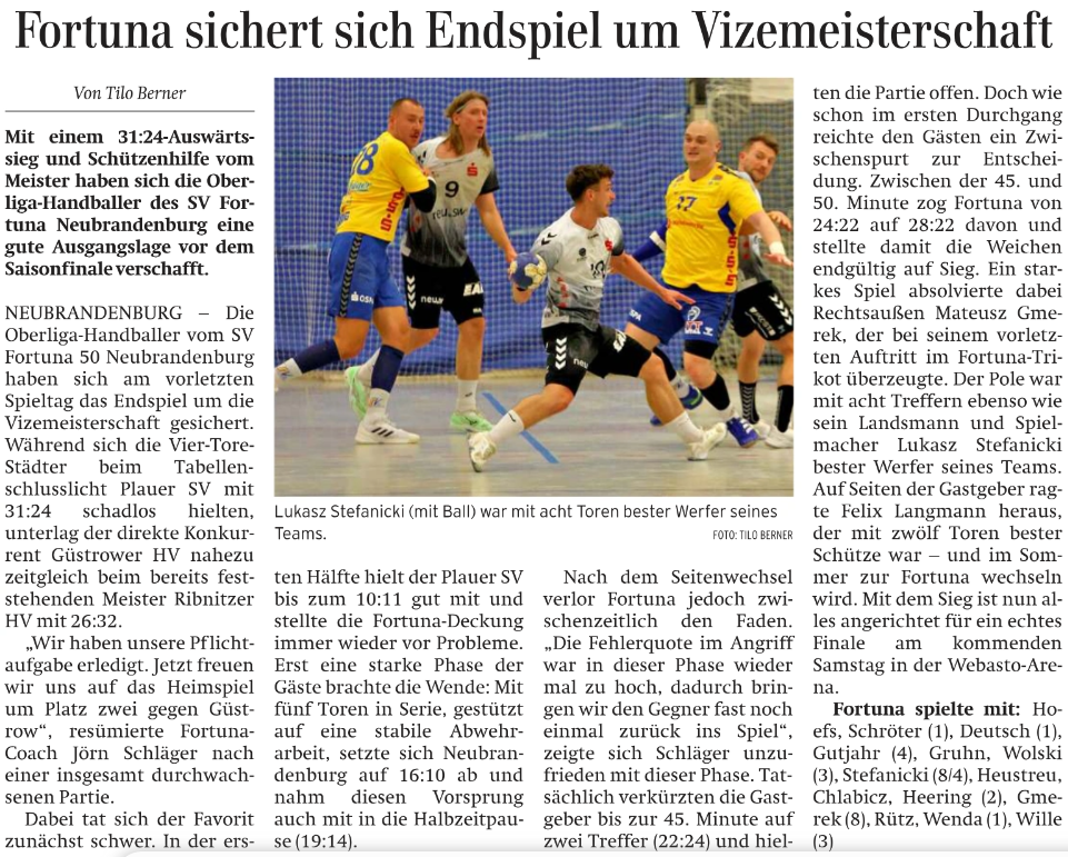 Nordkurier 20.04.2026: Fortuna sichert sich Endspiel um Vizemeisterschaft