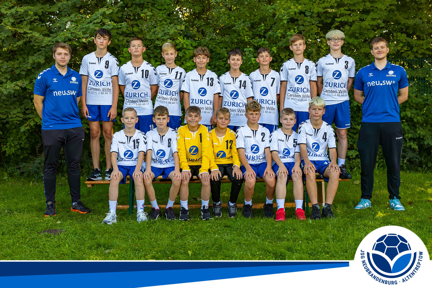 Hintere Reihe v.l.n.r.: Niklas Schröter (Trainer), Cavi Weihmann, Niklas Lerke, Philias Rüchel, Theo Saupe, Erik Neumann, Simon Starker, Anton Richter, Elias Borgwardt, Maksymilian Chlabicz (Trainer)