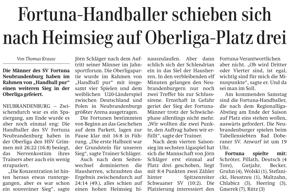 Nordkurier 24.11.2025: Fortuna-Handballer schieben sich nach Heimsieg auf Oberliga-Platz drei