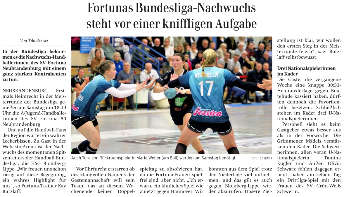 Nordkurier 23.01.2026: Fortunas Bundesliga-Nachwuchs steht vor einer kniffligen Aufgabe