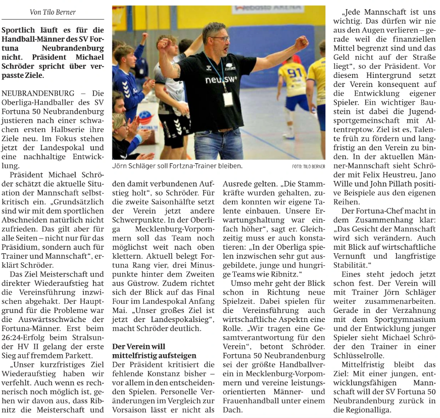 Nordkurier 09.02.2026: Jetzt möchte Fortuna Neubrandenburg den Landespokal