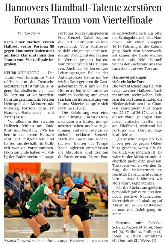 Nordkurier 18.02.2026: Hannovers Handball-Talente zerstören Fortunas Traum vom Viertelfinale